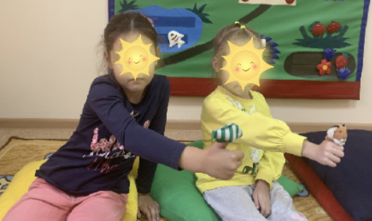 1. «Наблюдаем за пальчиковой игрушкой». Дети встают прямо, ноги на ширине плеч, стопы параллельны. Вытягивают перед собой правую руку, сжатую в кулак с выпрямленным большим пальцем, на большом пальце – пальчиковая игрушка. Взгляд направлен на игрушку. Начиная движение вправо-вверх рисуют перед собой в воздухе ленивую (горизонтальную) восьмерку. Середина восьмерки должна быть на одном уровне с срединной линией тела ребенка. Стараются рисовать максимально круглую восьмерку. Неважно, будет ли она большой или маленькой, главное, чтобы она была круглой. Взгляд все время направлен на кончик большого пальца – игрушку. Выполнив упражнение несколько раз, меняют руки. Левая рука начинает движение влево-вверх. Также делают несколько раз. После этого сцепляют две руки вместе в замок, большие пальцы перекрещены и делают ленивую восьмерку двумя руками. Взгляд не отрывают от перекрестья больших пальцев – игрушек. Головой не вертят, следят только глазами.