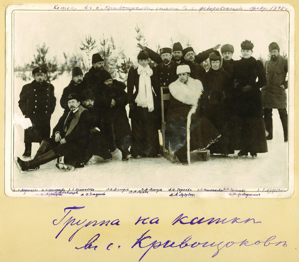 Все персонажи подписаны (даже в разрядке с местом положения). Итак, слева направо: В.С. Королёв, сидят С.П. Кузнецов и А.А. Ливенцов, стоят И.И. Филипов, Е.Е. Игнатьев (в очках), М.П. Чепурнов, Л.В. Алперс (с бантом), В.А. Линк (в форме), В.М. Алперс (в руками), М.А. Ауэрбах (сидит на финках), А.И. Горлов (в пенсне), О.С. Игнатьева, В.А. Раскин, В.П. Федоровская, Е.Г. Ауэрбах.