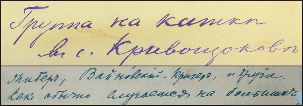 Во-первых, подпись «с. Кривощокове». Именно так обозначены 4 из 5 фотографий рассматриваемого периода (1894-1895 годов), до переезда Г.М. Будагова на работу в Томск. Сразу отметим, что все фотографии в альбоме подписаны лично Григорием Моисеевичем Будаговым. Это можно легко сличить при помощи рукописных листов его дневника.