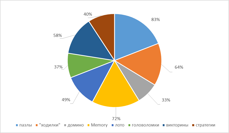 Когда встал вопрос разработки настольных игр, нам нужно было определиться с их разновидностью. Мы провели анкетирование среди учеников 2-3 классов по вопросу: в какие настольные игры вы любите играть? Был предложен выбор среди нескольких разновидностей: домино, Memory, лото, «ходилки», пазлы, головоломки, викторины, стратегии.