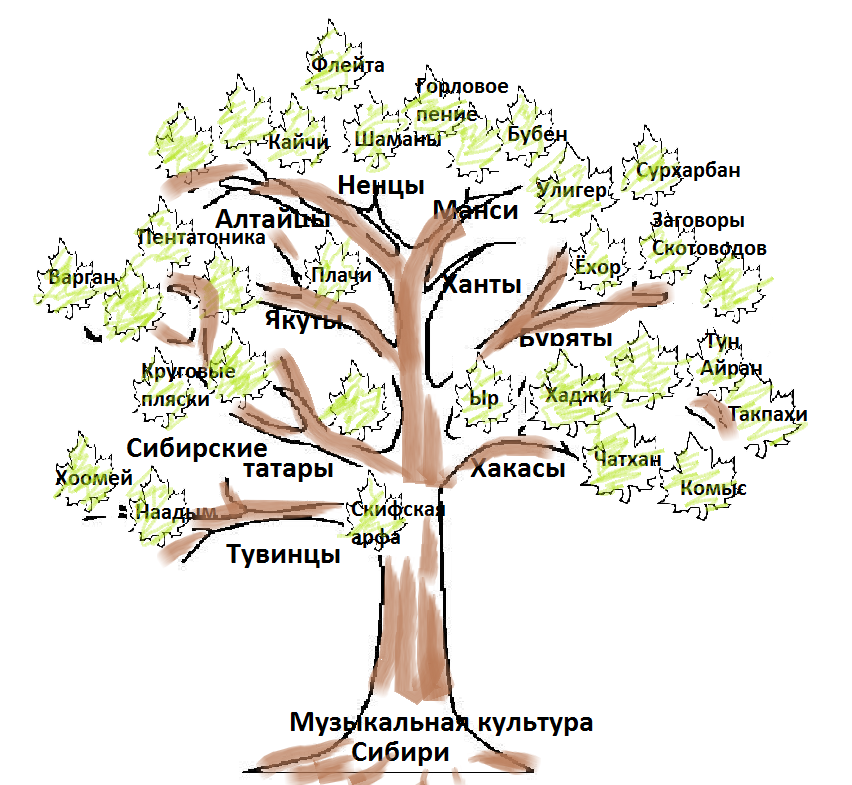 В начале урока предлагается актуализировать полученную информацию посредством подключения технологии «Кластер». В центре доски мы пишем словосочетание «Музыка народов Сибири», далее каждый желающий может выйти к доске и написать слово или словосочетание, имеющее отношение к первоначальному. Тот, кто выходит к доске и пишет слово, должен объяснить, каким образом оно связано с заданной темой. Это может быть представлено в самых разнообразных формах. В форме цветка, дерева и т.д.