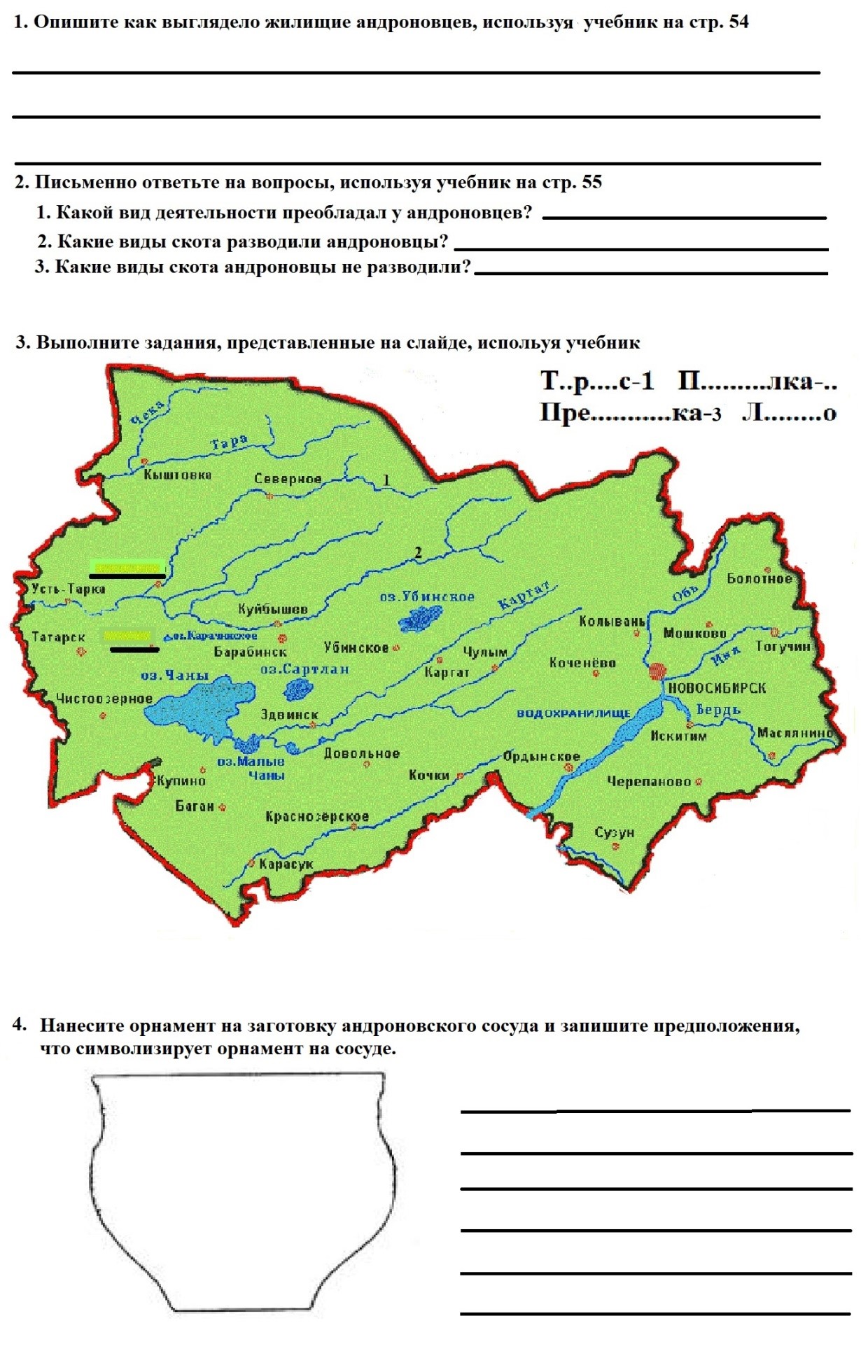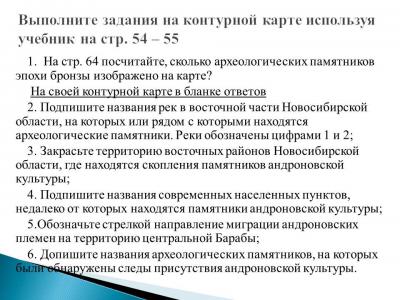 У вас на столах лежит подготовленный мной бланк ответов-карта, ваша задача заполнить его. Выполните первые два задания. В первом задании ваша задача, используя текст учебное пособие на стр. 54, выписать в бланк ответов описание жилища андроновцев. Во втором задании вы должны ответить на вопросы, указанные в бланке, используя текст учебного пособия на стр. 55.