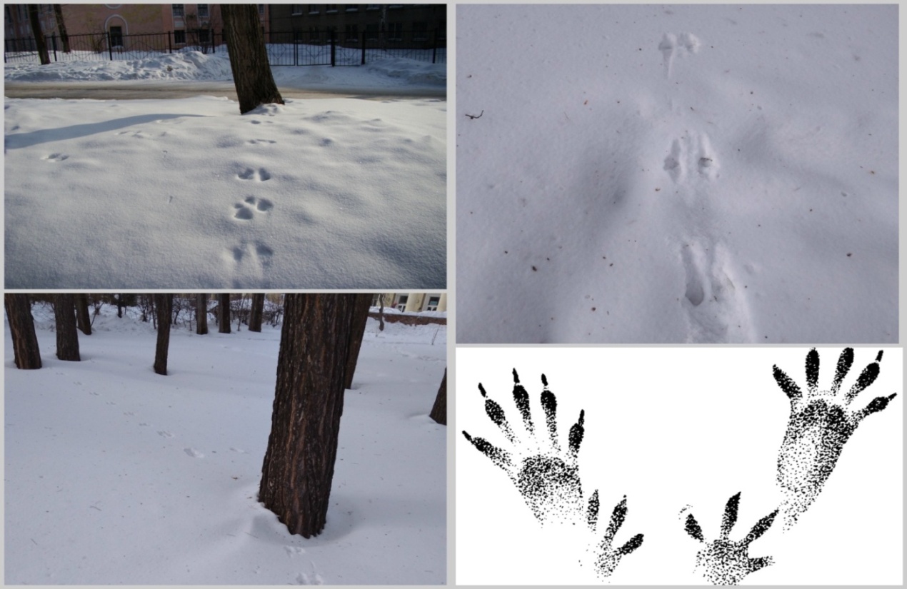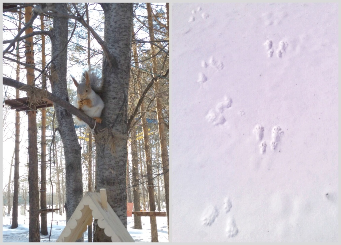 В парке и на прилегающей к нему территории, если удастся, то можно отыскать множество следов белки. Счастливчики спешат сделать фото, а особо внимательные ребята подмечают, что передние лапки у белки значительно меньше задних, в среднем их длина составляет 4х2 см и 6х4 см соответственно. Я обращаю внимание ребят еще на одну отличительную черту в строении лапок белки: передняя имеет четыре пальца, а задняя – пять. И тут я задаю вопрос «для чего?». И нужно отметить, что юные знатоки живой природы дают верный ответ: «чтобы лучше толкаться во время прыжка и цепче держаться за ветку».