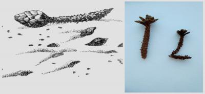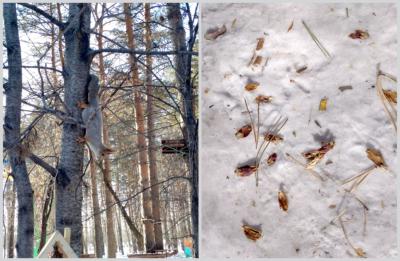 Гуляя по парку наблюдательные ребята также могут заметить на снегу остатки от еловых и сосновых шишек. Задаю вопрос: «чья это работа?». Конечно, это работа белки. Объясняю ребятам, что при добыче семян сосновой шишки белка разгрызает ее, поэтому внизу, на снегу, можно заметить кусочки чешуек.