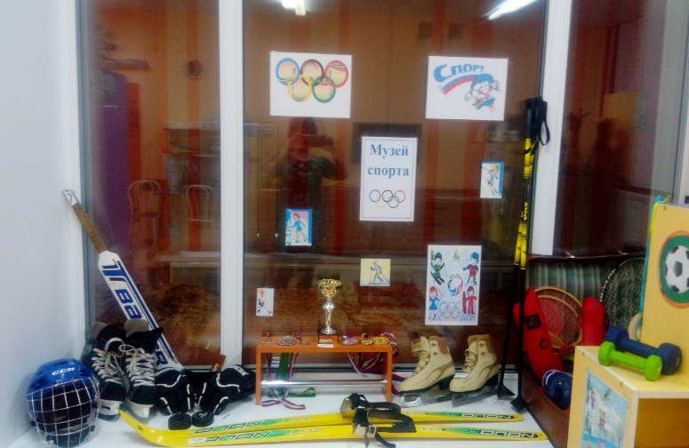 В нашем «мини-музее Спорта» собраны самые разнообразные спортивные экспонаты: разные коньки, шайбы, клюшки, шлем хоккейный, краги, боксерские груши, лыжи, награды за спортивные достижения: кубки и медали. Кроме этого, есть уголок самостоятельной деятельности, в котором собраны разные игры, фотографии, картины, открытки для рассматривания, дидактические игры: «Веселый хоккей», «Назови вид спорта «Подбери пару» и т. д. С помощью представленных в мини-музее атрибутов можно организовать интересную образовательную деятельность для детей по познавательному или речевому развитию, дошкольники легко и с интересом закрепляют знания о видах спорта, спортивных атрибутах, здоровье. Например, коньки бывают хоккейные и фигурные (можно назвать их отличия), виды спорта в которых нужны: фигурное катание, лыжные гонки и т.д. С помощью экспонатов мини-музея легко можно обучать дошкольников составлять различные описательные рассказы.