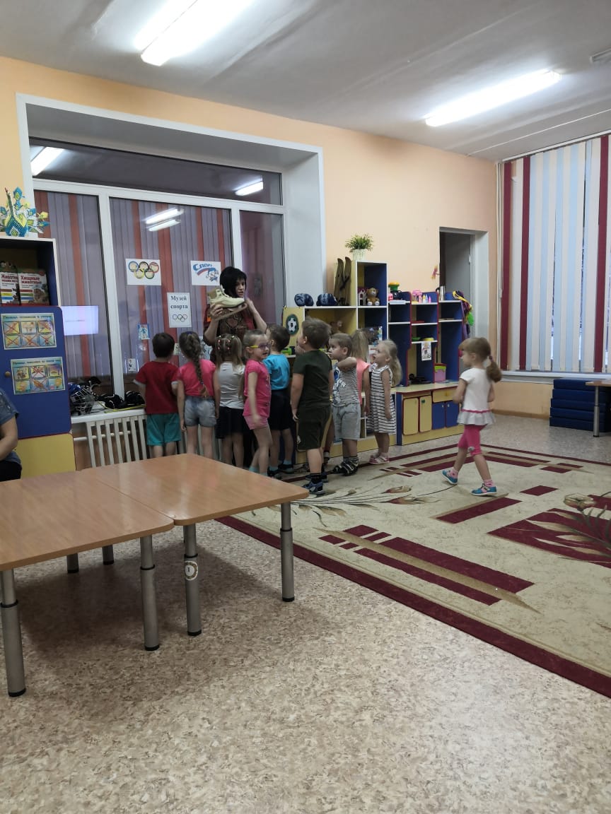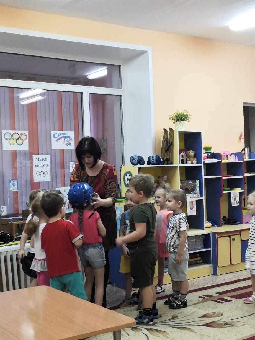 – Молодцы ребята, какие хорошие у нас фигуристы, хоккеисты и лыжники получились. Но каждому спортсмену для занятий нужен свой спортивный инвентарь. Давайте пройдём в наш Музей и рассмотрим, что нужно спортсмену для занятия спортом.