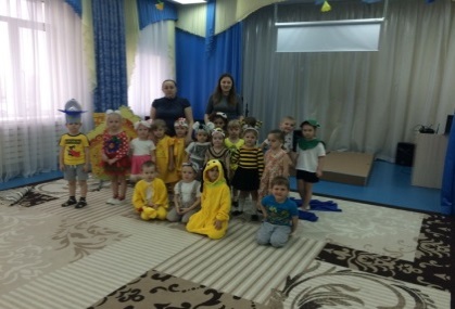 С детьми мы выбрали сказку «У солнышка в гостях». После прочтения сказки дети сами выбирали себе роли, рисовали афишу, лепили героев, совместно с родителями учили слова и готовили костюмы. Представление дети показали на уличной веранде детям младшей группы.