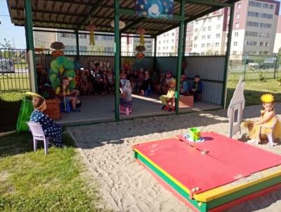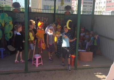 В летний период образовательная деятельность осуществляется на уличной площадке. Для того чтобы инсценировать сказку, педагогами была организована развивающая среда на веранде (ширма, маски, костюмы, пальчиковый театр, декорации и т.д.).