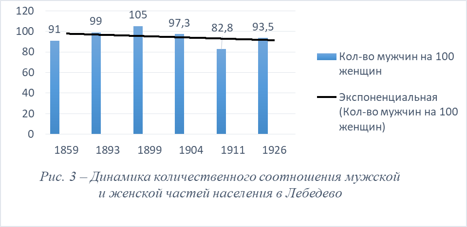 График наглядно показывает, что количество мужчин в населении на протяжении изучаемого периода было, как правило, меньше числа женщин: по данным 1859, 1893, 1904, 1911, 1926 гг. на 100 женщин приходится в среднем 92,7 мужчины. Единственный год, когда зафиксировано преобладание количества мужского населения – 1899 г. Этот феномен тоже можно связать с усиленным притоком переселенцев – доля мужчин в их семьях была повышенной. При этом представленная на графике экспоненциальная линия тренда свидетельствует о тенденции сокращения доли мужского населения в Лебедево. Эту тенденцию можно связать с происходившими в начале ХХ в. большими мужскими потерями в ходе Русско-японской, Первой мировой и Гражданской войн.