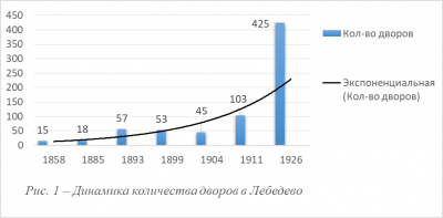 Таблица 1 свидетельствует о непоследовательности изменений количества дворов в Лебедево: до начала ХХ в. оно то увеличивалось, то сокращалось. Более определенную картину представляет построенная нами столбчатая гистограмма с добавленной степенной линией тренда (рис. 1). На гистограмме очевидна генеральная тенденция роста количества домохозяйств. В течение 67 лет их численность возросла в 28 раз, то есть в два раза больше, чем общая численность населения.