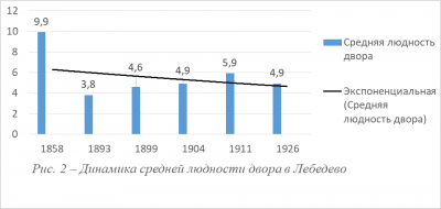 Созданная мною таблица 1 содержит диахронический ряд высчитанных показателей людности дворов в Лебедево. Мы видим, что домохозяйства в этом поселении со временем меняли свою людность противоречивым образом, что наглядно демонстрирует гистограмма, помещенная на рисунке 2. Экспоненциальная линия тренда свидетельствует, при этом, что господствовала тенденция к уменьшению показателя. Его наибольшее значение было зафиксировано в «Списке населенных мест» 1858 г., когда еще господствовала традиционная большая патриархальная семья со сложносоставной структурой. Всплеск людности наблюдается еще по данным 1911 г., и он скорее всего связан с притоком в Лебедево, как и в другие старожильческие поселения Приобья, переселенцев из Европейской России. У них были относительно многолюдные семьи, и она зачастую в первое время после переезда устраивались на подворьях старожилов.