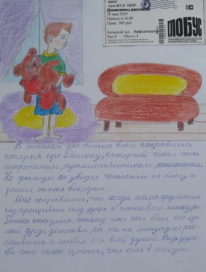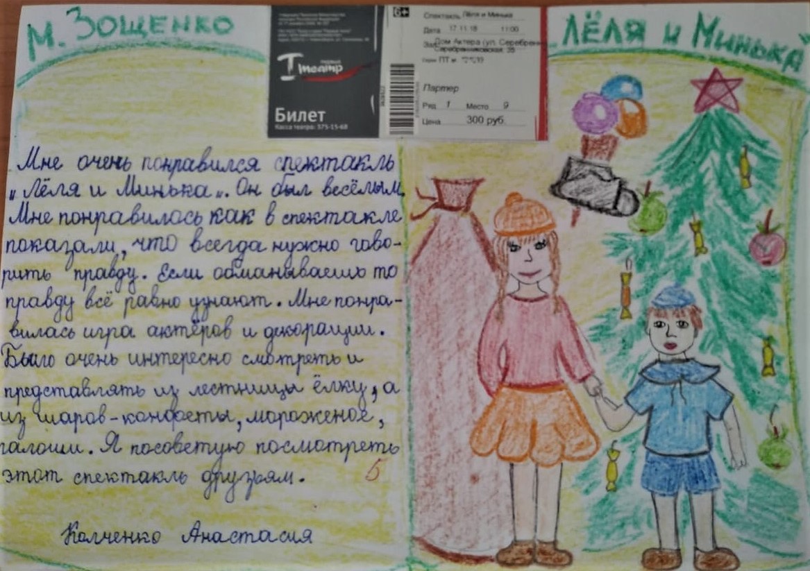 Часто перед предстоящим театральным выходом использую приёмы, повышающие интерес к предстоящему спектаклю: афишу, анонс, чтение отрывка из художественного произведения. Всё это позволяет настроить юных зрителей на восприятие спектакля. После спектакля всегда провожу работу по оценке впечатлений. Это рисунки в 1 классе, небольшие сочинения из 2-3 предложений с иллюстрациями во 2 классе. В 3-4 классе переходим к написанию отзывов о спектакле. Составляем отзыв примерно по такому плану, добавляя пункты по мере взросления ребят: