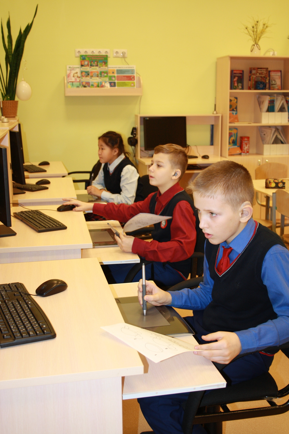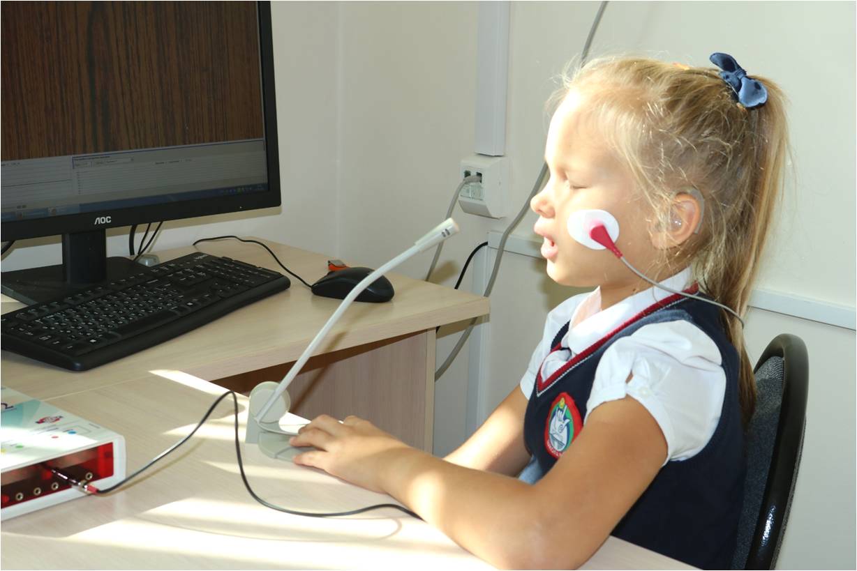 Каждый ребенок начальной школы обеспечен ФМ-системами Roger компании Phonak. Данная система обеспечивает беспроводную цифровую передачу звукового сигнала. У учителя небольшой передатчик, у ребенка – беспроводной приёмник, который передаёт на слуховой аппарат или кохлеарный имплант звук высокого качества, понижает уровень бытового шума. Для осуществления коррекционной работы по развитию словесной речи, формированию и развитию речевого слуха, развитию умения пользоваться кохлеарными имплантами 12 кабинетов индивидуальных занятий оборудованы компьютерами, акустическими колонками мощностью 100Вт и диапазоном частот 72-17000Гц, медиа-клавиатурами. Музыкально-ритмические занятия проходят в зале, оснащенном акустической системой звукового поля, цифровым пианино, музыкальными инструментами.