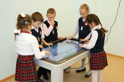 Эффективным решением стал кабинет проектной деятельности, оснащенный цифровыми лабораториями для начальной школы «Здоровье», «Экология», «Погода». Интерактивный стол на 6 пользователей в режиме «мультитач» с возможностью автоматической оценки вклада каждого пользователя в работу, набором обучающих программ, шаблонов, а также наполнения урока собственными учебными материалами в ОС Windows. Малыши рады и игровым столам, которые являются эффективным средством для организации сюжетно-ролевых игр с использованием разнообразных основ ландшафтов, навыков конструктивной деятельности, развития элементарных математических представлений, пространственного восприятия, творческих способностей. Столы позволяют проводить игры по развитию речи, представлений об окружающем мире, социально-коммуникативных навыков.