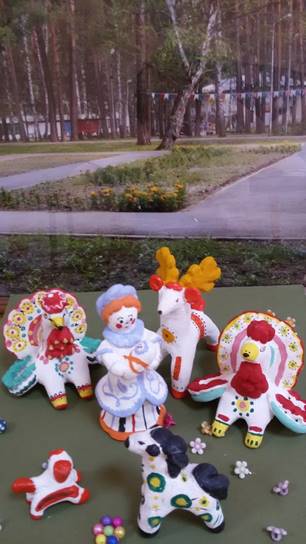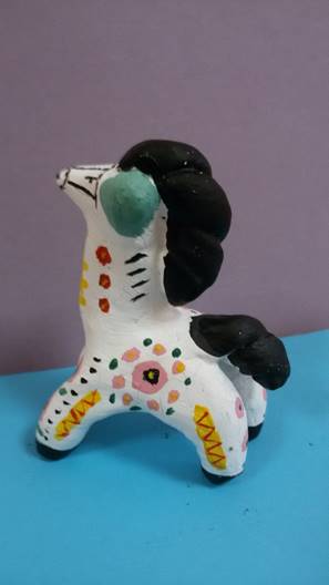 Первое занятие в кружке начинается со знакомства детей (численность 10-12 человек) с историей возникновения дымковской игрушки, с её особенностями и наглядной демонстрацией фигур лошадок, петушков, баранов, собачек, барышень, оленей. Но сначала всем предлагается выполнить фигурку лошадки.
