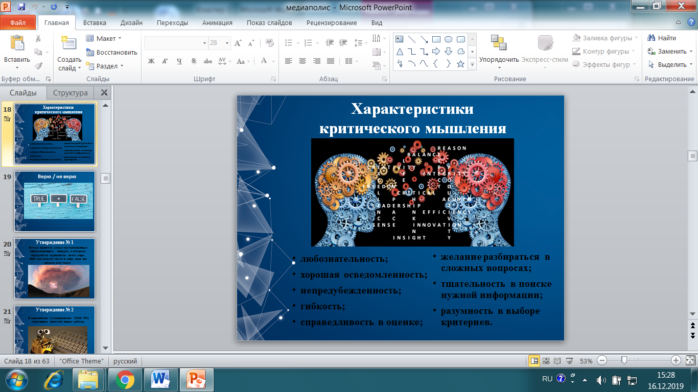 В настоящее время большое внимание уделяется работе с одаренными детьми, созданию условий, обеспечивающих их выявление и развитие. Одной из приоритетных задач является развитие интеллектуальных способностей учащихся. Одаренные дети – категория, которая нуждается в особом внимании со стороны окружающих. Необходимо повышать уровень их критического мышления, т.к. эта категория детей особо ранима при соприкосновении с несправедливостью мира. Сейчас нас окружает огромное количество средств массовой информации и массовой коммуникации, и задача взрослых не только оградить ребенка от негативной информации, но и научить его правильно воспринимать эту информацию. Мы, к сожалению, не всегда можем отследить, какой контент потребляют наши дети, и поэтому обязательно нужно научить их скептическому отношению ко всему увиденному и услышанному, т.е. критическому мышлению при работе с информацией.