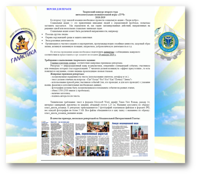 В ЦВР «Галактика» ведется планомерная работа по росту качества организуемых мероприятий. Так, в Открытом городском конкурсе «Сибирь и сибиряки в годы Великой Отечественной войны» появились номинации, связанные с медиаформатами: «Создание рукописного журнала», «Заметки журналиста», «Видеофильм и мультимедийная презентация». В рамках социального проекта «Мы – наследники Победы» функционирует конкурс видеоматериалов, которые могут быть представлены в различных жанрах.