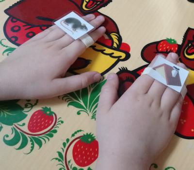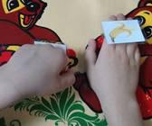 Далее можно надевать пособие – браслеты на ладони и применить его в движении, по очереди выпуская по одной карточке и скрывая другую. При этом называть ту карточку, которая видна.