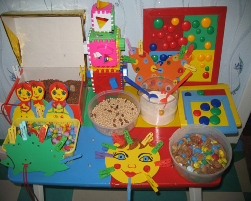 Для развития у малышей мелкой моторики рук ежедневно проводила с ними пальчиковую гимнастику, пальчиковые игры. Широко использовала игры с природным материалом (шишками, грецкими орехами, крупами), с колючими массажными мячами, пуговицами, прищепками, мелким конструктором, шнуровки, пазлы.