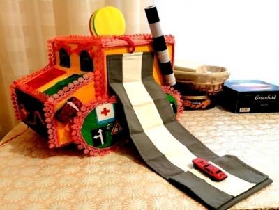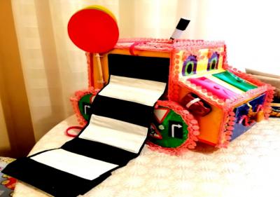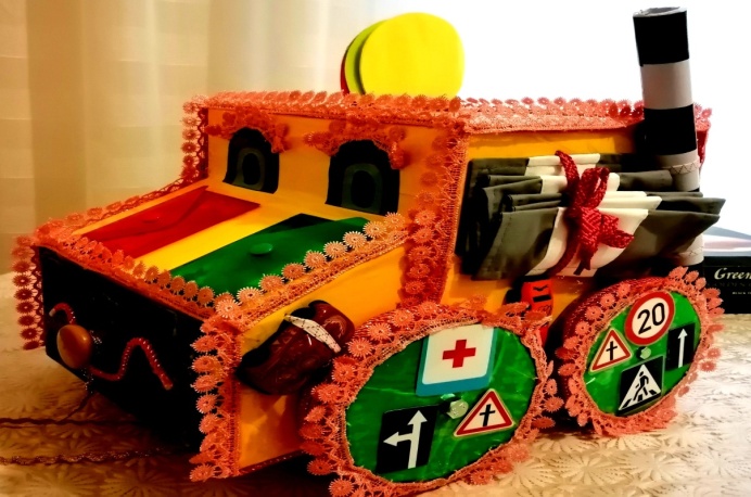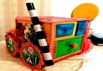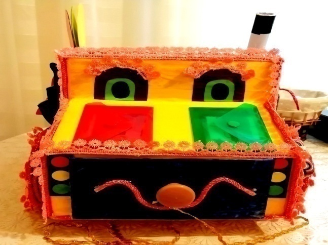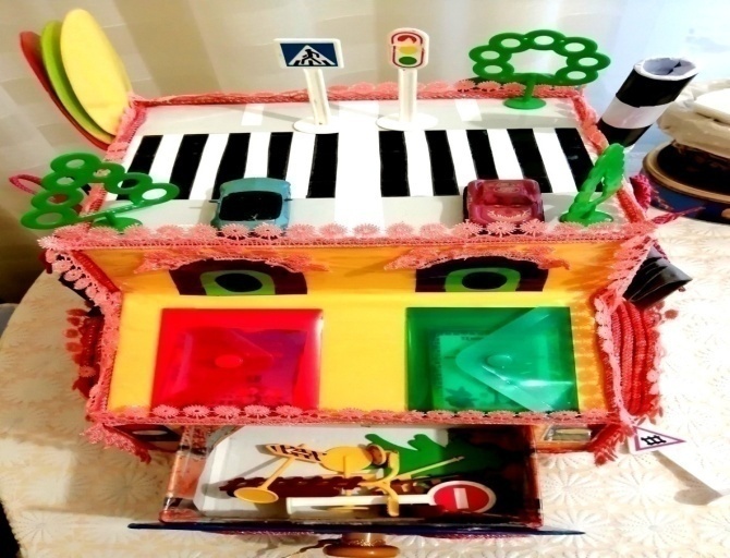 Многофункциональное дидактическое пособие «Автомобиль» – это авторское пособие, которое предназначено для детей раннего и младшего возраста. Изготовлен он из бросового материала, а именно: картонных коробок из-под обуви, остатков текстиля, шнурков, резинок, картонных втулок, палочек из-под роллов, мороженого и т.д.