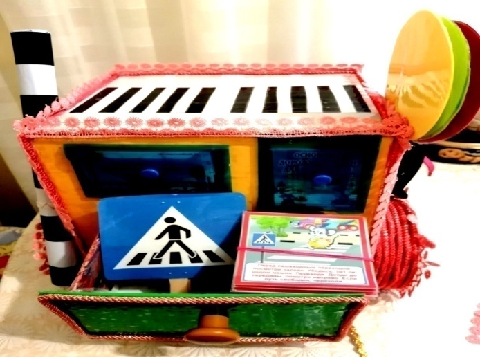 Там же внизу расположен выдвижной ящик, где находятся дорожные знаки: «Пешеходный переход» – 2 штуки, пешеходы (человечки), карточки с различными ситуациями на дороге.
