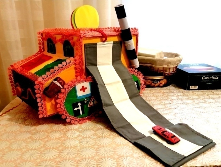 На противоположной стороне располагаются тоже два колеса с обозначениями дорожных знаков: «Ограничение скорости 20», «Пересечение дороги», «Пешеходный переход», «Медицинский пункт», «Железнодорожные ограждения», «Дорога прямо», «Дорога прямо и налево». Сверху расположена дорога, сшитая из хлопчатобумажной ткани. Ее можно развернуть, расправить, упражняться, как машины ездят по дорогам. Сворачивается книжкой, держится с помощью завязки-шнурка, снизу и сбоку на резинках прикреплены машинки, справа также на резинке расположен жезл, который нужен для регулирования движения на проезжей части.