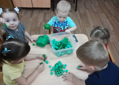 Чтобы познакомить детей с основными формами строительных деталей (кубик, кирпичик, шар) и способами конструирования, в группе подобран традиционный материал для строительных игр (пластмассовый, деревянный, мягкий цветной конструктор), так и нестандартный. Это обычные губки для мытья посуды, которые являются замечательными «кирпичиками» для построек. Они легки, устойчивы, имеют различную фактуру, цвет, форму. Я предлагала малышам поиграть с деталями строительного материала, постукивать деталь о деталь, накладывать одну на другую, приставлять, прикладывать, познавать элементарные действия. Дети запоминали и узнавали предметы по более характерным признакам и свойствам. Раскладывали и группировали разнородные детали по признакам: цвет, форма, материал, фактура, размер, складывали на место в конце игры. И как результат малыши научились различать основные виды строительных материалов (кубик, кирпичик); группировать объекты по сенсорным признакам: величина, цвет, форма; развивали моторику рук. Я заметила, что такие занятия помогали детям легко и быстро адаптироваться к новой среде.