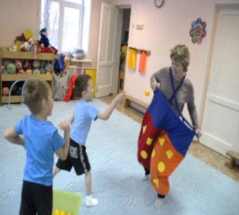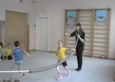 – Тоннели для шариков. Данное пособие можно использовать в эстафетах. Дети делятся на две команды, каждый участник должен прокатить шарик по тряпочному тоннелю. Можно использовать разные способы прокатывания шарика: руками двигая его по тоннелю или взмахивать тоннель до выкатывания из него шарика. Для усложнения задания можно использовать шарики разного размера.