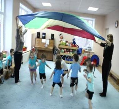 – «Парашют». Двое взрослых или детей держат «парашют» за края, а группа детей перебегает на другую сторону, выполняя команды ведущего: пробежать спиной, перейти «гуськом», проползти на четвереньках и т.д. Вариант игры может быть и другой: дети разбегаются по залу, а по сигналу ведущего необходимо успеть собраться под «парашютом».