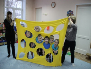 – «Сырная стенка». Двое взрослых или детей держат «сырную стенку» по краям. Детям даются задания: проползти в окошечки вперед головой, боком, спиной.