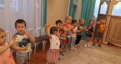 Недавно я для себя открыла инновационную технологию оркестра, которую применяю на своих занятиях, автором является Татьяна Анатольевна Боровик «Хор рук». Это нетрадиционное исполнение ритмического рисунка с помощью ладоней. Этот способ удобен тем, что «музыкальный инструмент» находится всегда под рукой. Это не обычный оркестр с шумовыми инструментами, а двигательное двухголосье рук с помощью дополнительных атрибутов, будь это снежинки, листики, цветы, бабочки и т.д. Дети делятся на два ряда. В первом ряду дети сидят на стульчиках и исполняют «первую двигательную партию». Вторую партию исполняют дети, которые стоят позади первых и исполняют свою партию.