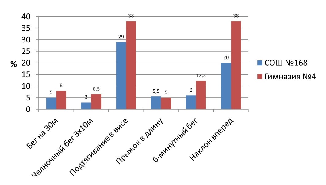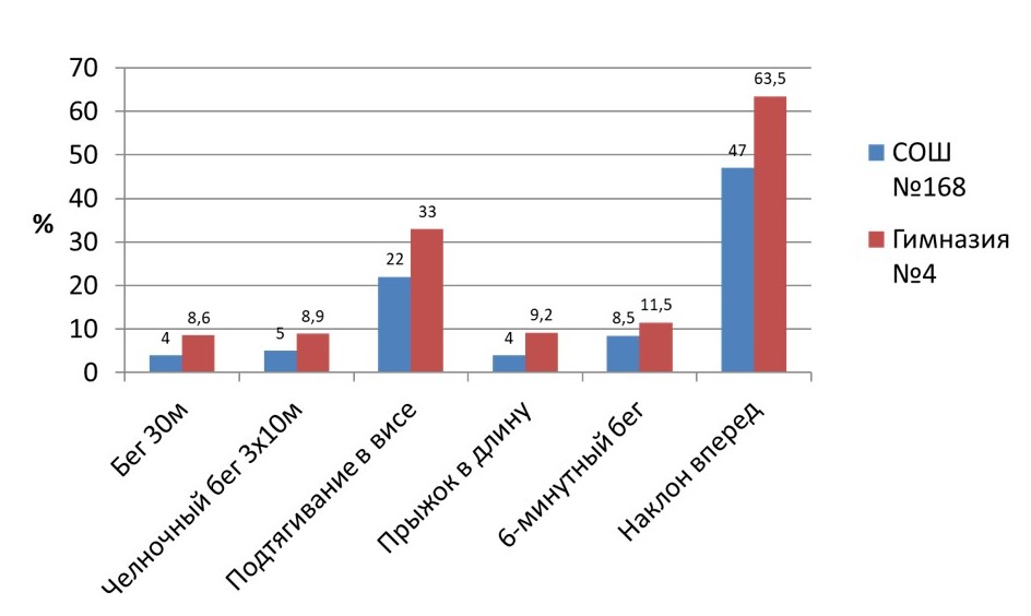 Итоговое тестирование показало, что у юношей, обучающихся в школе № 168, произошли достоверные различия по двум показателям: это подтягивание в висе и наклон туловища вперед. Сравнительный анализ результатов первого и второго тестирования у юношей Гимназии № 4 выявил достоверные различия по всем показателям (Р>0,05).