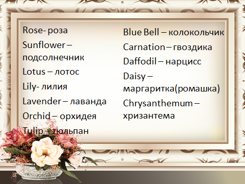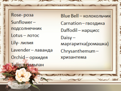 Активная лексика: carnation, daisy, quantity, sunflower, tulip etc.