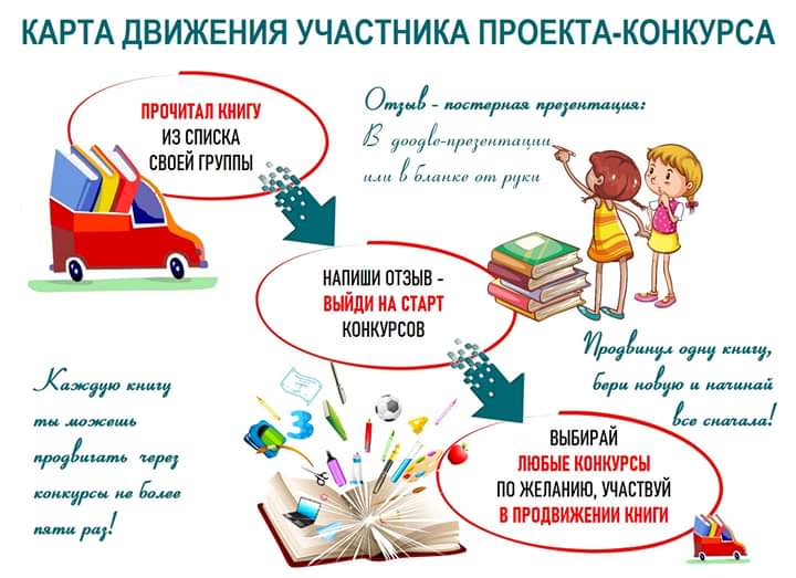 Продвижение прочитанной книги – это участие книги через ее читателя в мини-конкурсах и мини-проектах. Для этого в списке конкурсов можно выбирать любые конкурсы по интересам (но не более 3-х на одну книгу).