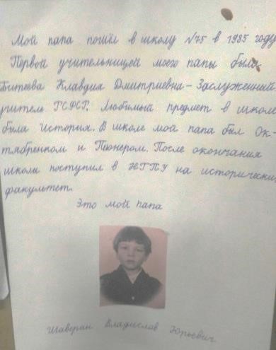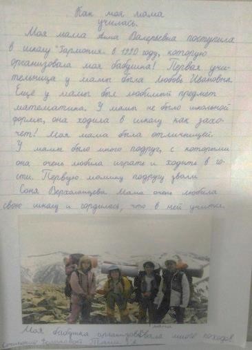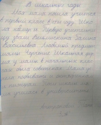 В результате получились увлекательные сочинения о детстве и юности родителей. Каждый ребенок с гордостью представлял свою работу, отмечая, что с большим интересом знакомился с мамой-школьницей или с папой-сверстником, узнавал об их творческих увлечениях и спортивных достижениях. Родителям тоже было приятно очутиться в своем детстве, вспомнить одноклассников, надежды и чаяния юности. Оказалось, что две пары родителей учились в одних и тех же школах приблизительно в одно время. Некоторые семьи показали воочию детям свои школы, жаль, что зайти туда в наше тревожное время не получилось.