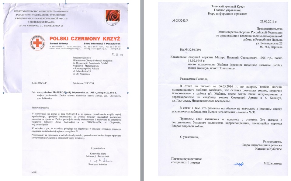 Но мне хотелось бы рассказать об опыте поиска захоронений воинов периода Великой Отечественной войны. Все началось с того, что мне пришлось с помощью архивов искать своего деда, без вести пропавшего в годы войны. Когда я рассказала об этом своим активистам – ко мне подошел семиклассник и попросил помочь в поисках и его семье. Его дед без вести пропал в 1945 году. Вместе с его семьей мы писали запросы в многочисленные архивы, в военкоматы, общались на специализированных сайтах с профессионалами. За несколько лет нам удалось установить номер части, где служил его предок, восстановить боевой путь дивизии. На основании этих документов, и, зная уже дату гибели солдата, мы установили, что его жизненный путь оборвался на территории Польши, при освобождении деревни Забница. Мы написали запрос в Красный Крест Польши. Ответа пришлось ждать почти год! Но он был получен! Мы узнали точное место захоронения нашего солдата. Братская могила № 31 кладбища города Хочанув. Без вести пропавшим много лет он считался из-за ошибки писаря, неправильно написавшего фамилию солдата при заполнении документа о боевых потерях дивизии.