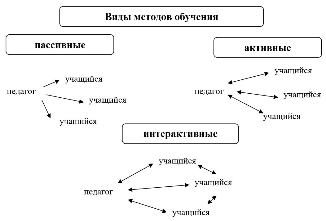 В отличие от пассивных и активных методов, интерактивные методы позволяют организовать большее поле взаимодействия учащегося: в него включается не только педагог, но и сверстники с разным опытом, культурой, уровнем знаний. Педагог выступает в интерактивной модели обучении партнером учащегося, поддерживает активность участников, старается выявить многообразие точек зрения, поощряет творчество. Усилия педагога направлены на облегчение восприятия, усвоения, взаимопонимания участников образовательного процесса.