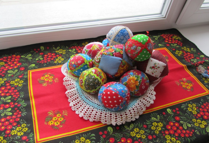 Так, 1-й вариант – традиционный мяч набивается мхом. 2-й вариант – набивка синтепоном. 3-й вариант – мяч-погремушка может иметь жесткую конструкцию. Дети выбрали второй способ. Работа закипела: яркие ткани, горох в коробочках для шума, упрощенная сборка. Участвовали дети, умеющие шить и слабо, и хорошо. С заданием справлялись все ребята, и мальчики, и девочки.