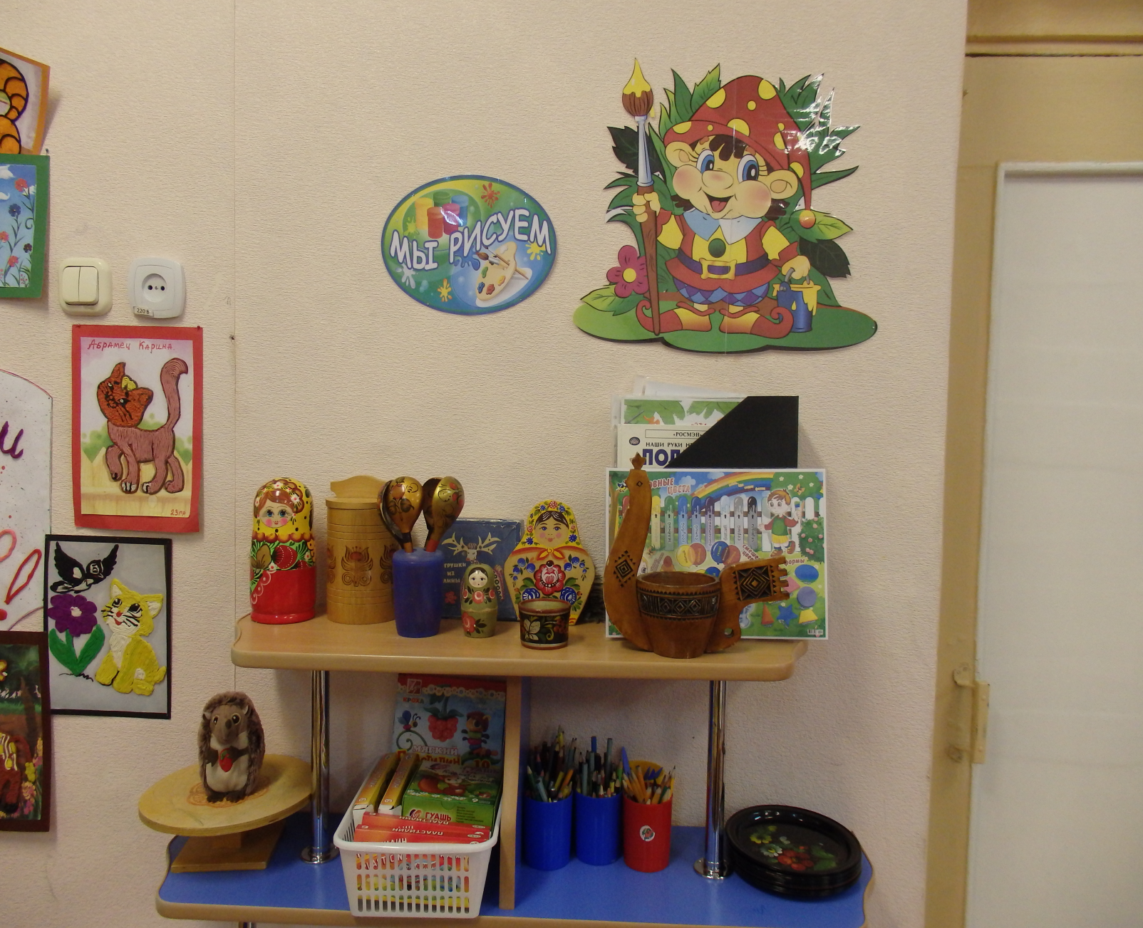 Важная роль в развитии творческих способностей малышей играет развивающая среда. В группе создан уголок творчества, в котором имеются различные материалы для рисования, лепки, аппликации; трафареты для рисования, раскраски по темам; подобрана литература с иллюстрациями пошагового рисования, образцов для лепки по различным темам; различные матрешки, посуда, расписанная в технике хохломы, дымковская игрушка, посуда-гжель.