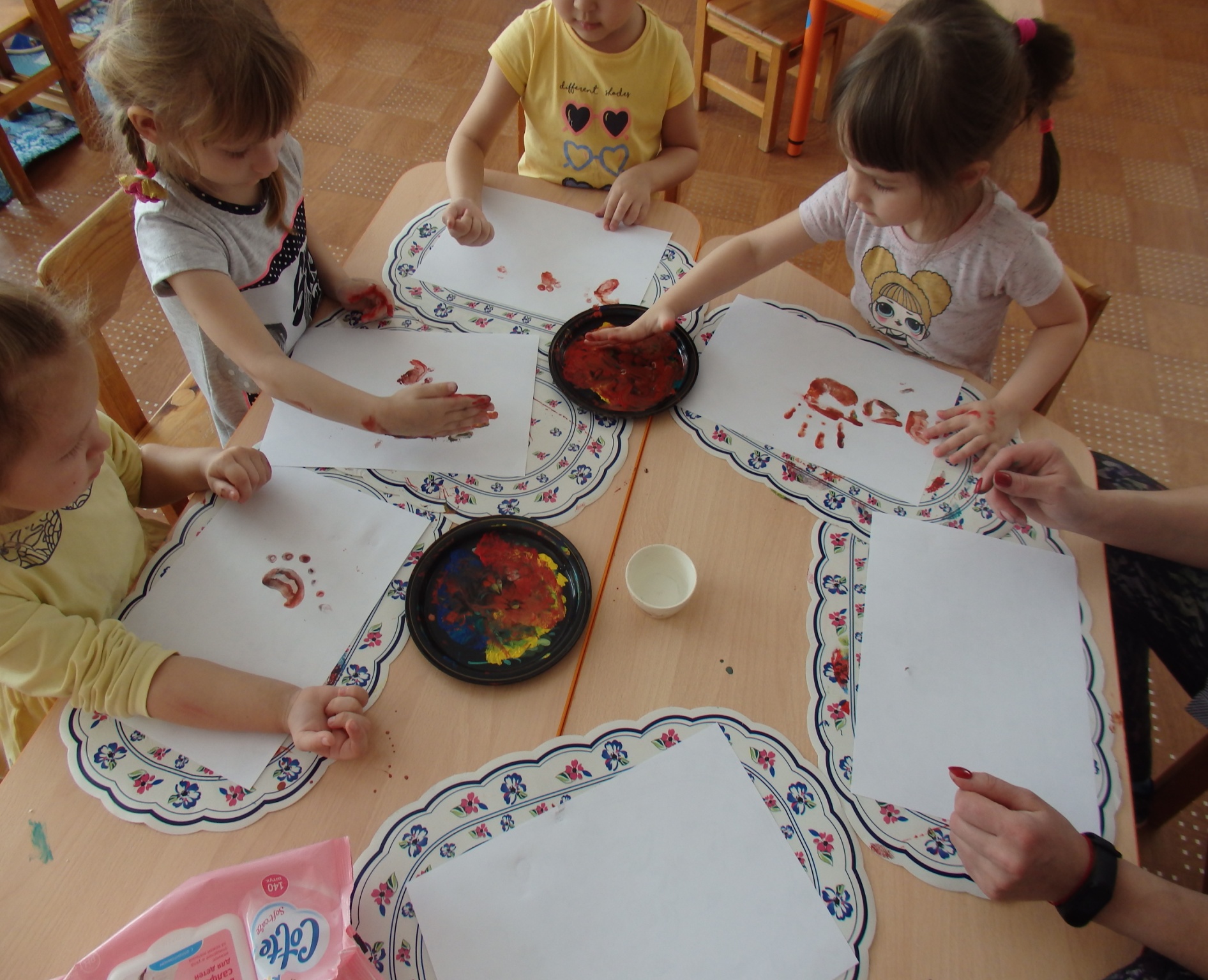 На начальном этапе большое внимание во время рисования, лепки, аппликации с малышами уделяла созданию правильного эмоционального фона, так как заметила, что мои малыши часто были недовольны результатом своей деятельности, что сковывало их инициативу, появлялись барьеры в творческой активности. Поэтому всеми средствами создавала у малышей положительный настрой во время изобразительной деятельности: похвалу детей различными персонажами, игровые моменты.