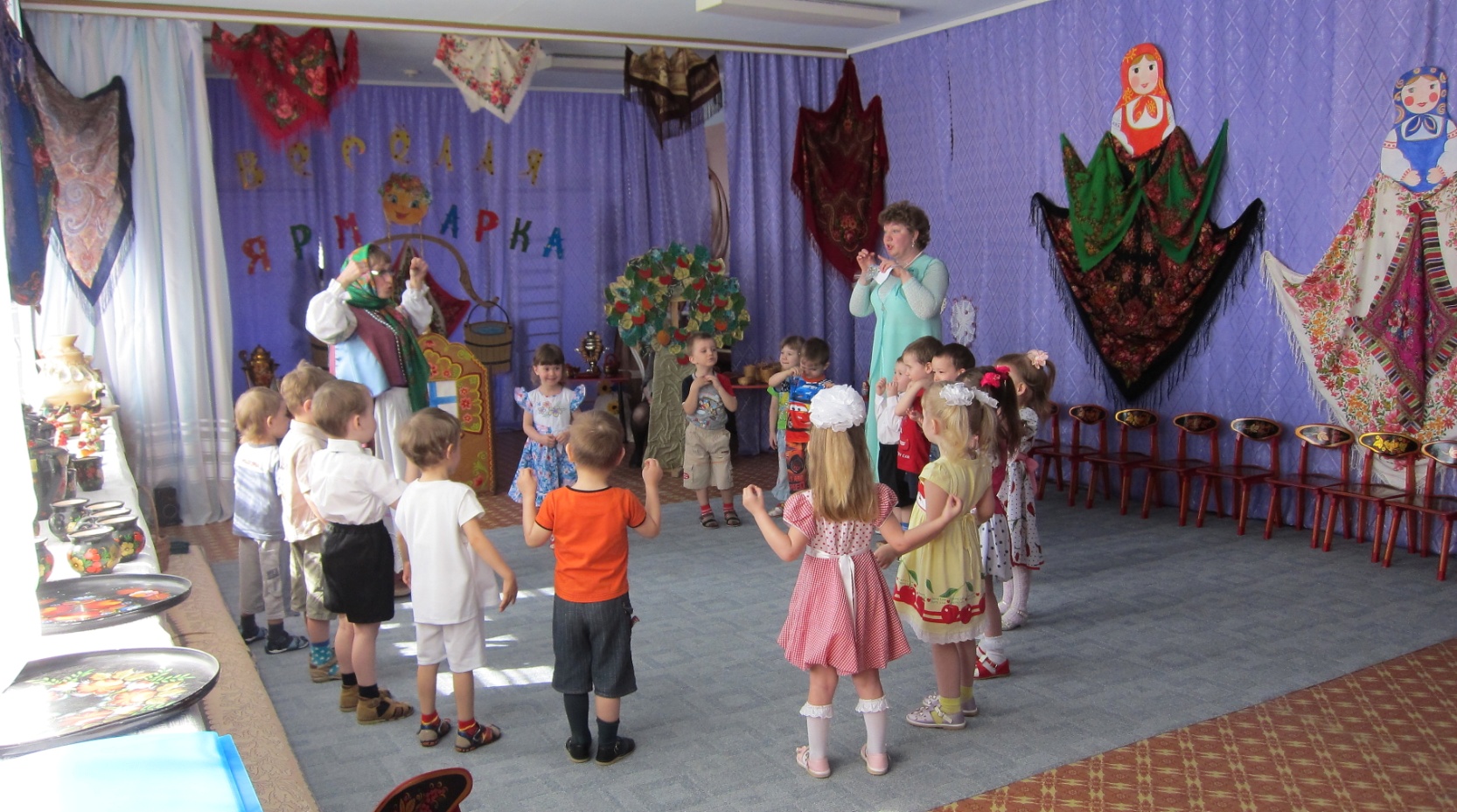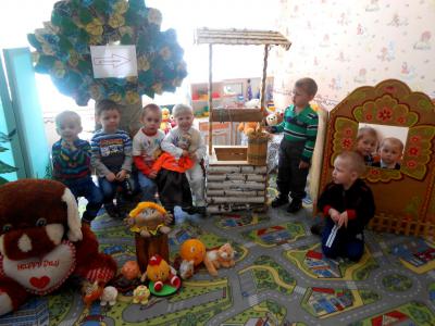 В интерьере группы использовали сюжеты из произведений, поэтому малыши быстро знакомились с героями потешек и проявляли к ним интерес.