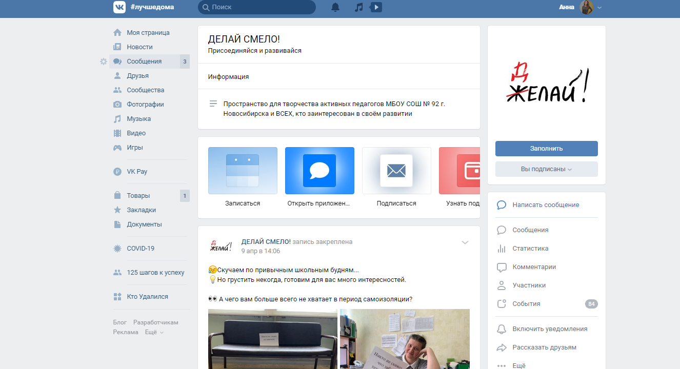 Социальная сеть «Вконтакте» позволяет создавать различные виды сообществ: тематические, организация или бренд, группа по интересам, публичная страница. Каждый тип сообщества имеет свои уникальные возможности и подбирается специалистом под конкретные нужды. Управление сообществом позволяет включать в него отдельных пользователей, зарегистрированных в социальной сети «Вконтакте» или сделать его общедоступным для всех пользователей данной сети. В сообщество можно добавлять различные виджеты, которые структурируют деятельность специалиста, например, при помощи приложения «Запись» можно настроить календарь для записи на психологическую консультацию. Интуитивный интерфейс позволяет максимально ярко формировать контент для публикации. В качестве контента могут быть представлены краткие посты; развернутые посты на актуальную для пользователей тематику; видеоролики, рисунки, фотографии, активные ссылки, QR-коды и многое другое. Администратор сообщества имеет возможность проводить прямые трансляции, комментировать записи подписчиков, отвечать на сообщения и т.д. В сообществе педагог-психолог может планировать и проводить акции, марафоны, размещать чек-листы полезных привычек и мн. др. Особенность данного вида деятельности состоит в том, что она отвечает требованиям конкретной образовательной организации, рассчитана на определенный контингент участников, выстраивается в соответствии с их запросами.
