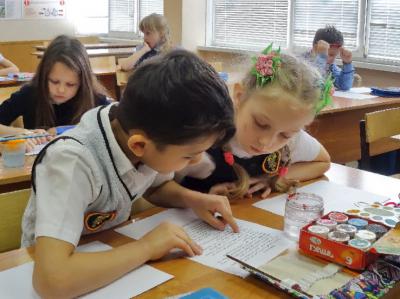 5. Цветовые эмоции. 4 ученика из класса по очереди читают наизусть стихотворения про осень и зиму (А.С. Пушкин «Зимний вечер», А.С. Пушкин отрывок «Евгений Онегин», А.А. Фет «Ласточки пропали», Н.А. Некрасов «Славная осень»). А остальные ребята мазками гуаши выражают свои цветовые эмоции. То есть на альбомный лист бумаги наносят мазки теми цветами, которые они увидели, услышали при прослушивании стихотворений.