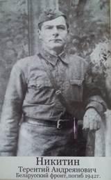 Когда я думаю о своей семье в годы Великой Отечественной войны, то вспоминаю своего прапрадеда, о котором мне рассказывала моя прабабушка. Звали его Никитин Терентий Андреянович. Родился он в 1903 году, в селе Макаровка Новосибирской области. До войны он работал на железной дороге. У него была большая семья, пятеро детей. Когда началась война, его призвали защищать Родину. Ему было 39 лет. На фронт он ушёл в январе 1942 года. Воевал под Великими Луками, где в то время шли тяжёлые, кровопролитные бои. Освобождая от фашистов этот город, в том бою погибли десятки тысяч советских солдат. В этих боях 28 мая 1942 года погиб мой прапрадед.