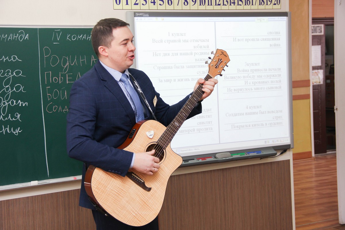 Учитель вместе с учащимися исполняет готовую песню под гитару.