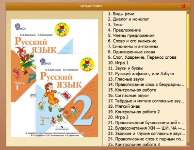 Данные средства используются в мультимедийных приложениях ко всем учебникам и рабочим тетрадям, входящим в Федеральный перечень и разрешенным для использования в начальной школе. Важно отметить, что материал отвечает возрастным особенностям каждого года обучения. На рисунке 1 представлено приложение для второго класса по русскому языку учебно-методического комплекта «Школа России».