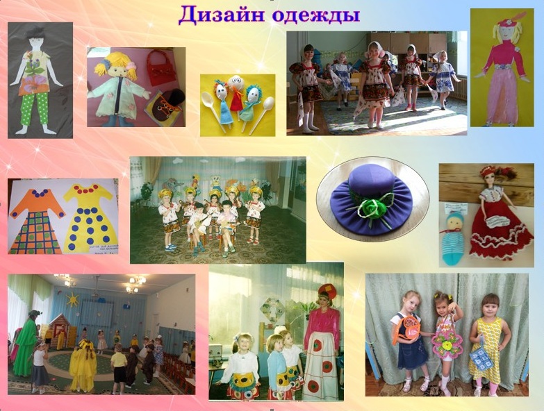 «Дизайн одежды» – знакомила детей с культурой одежды и некоторыми доступными дошкольникам способами создания рисунков-эскизов, фасонов и декоративной отделки. Дети создавали эскизы костюмов, декоративные украшения для персонажей литературных произведений, спектаклей, открытых мероприятий, а также для себя, близких и кукол – одежды повседневной и праздничной.