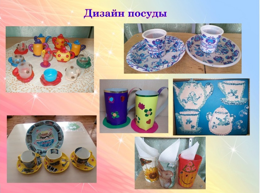 «Дизайн посуды». Маленькие дизайнеры придумывали новую посуду, сервизы, например: «Стаканчики для карандашей», «Посуду для кукол», «Салфетницы» и др.