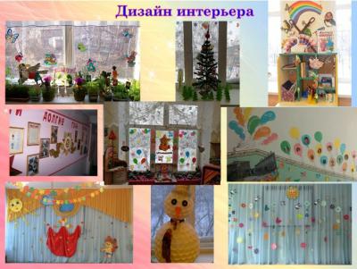«Дизайн интерьера» – сначала знакомила детей с благоустройством кукольно-игрового пространства (создавали макеты комнат, домиков, используя подручные материалы, конструировали и расписывали несложные элементы обстановки: обои, занавеси, мебель, скатерти и т.д.). Затем приобщала детей к созданию предметно-окружающей среды. Вместе с детьми оформляли помещения детского сада, группы, зала, вестибюля.