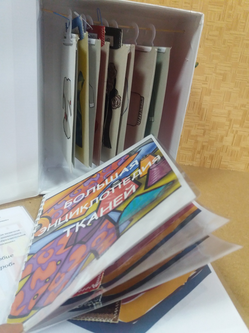 Одно из таких пособий – «Волшебный гардероб». Практически все дети играют в куклы. Какое же удовольствие доставляет ребятам наряжать кукол, создавать новые образы. И мы воспользовались этим интересом. Данная игра состоит из игрового шкафа; конвертов из картона с прорезанными силуэтами одежды (пальто, куртка, платье, сарафан, юбка, брюки, шорты); лоскутов ткани, наклеенных на картонные прямоугольники (шерсть, шелк, хлопок, трикотаж, велюр и пр.); стойки для одежды; энциклопедии тканей; тканевой маски для глаз. Цель пособия: создание условий для проявления детской инициативы и самостоятельности в творческой познавательно-исследовательской деятельности, конструировании и др.